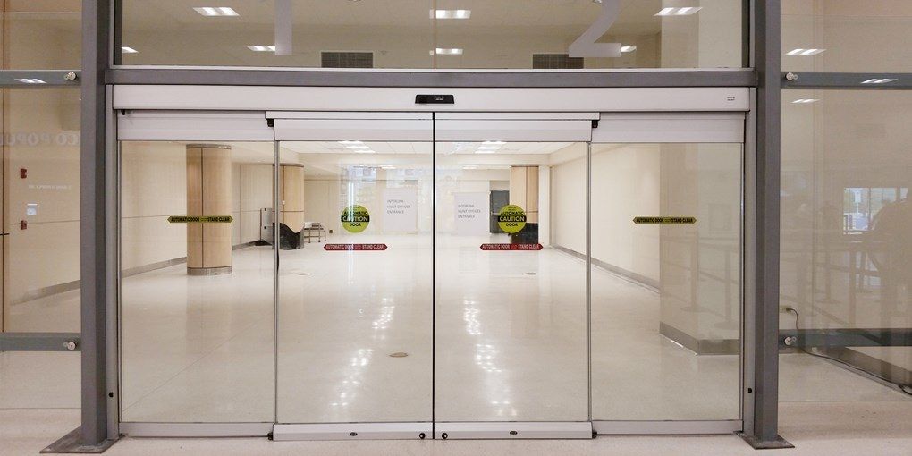 Противопожарная безрамная дверь со стеклом в бизнес центр в Серпухове