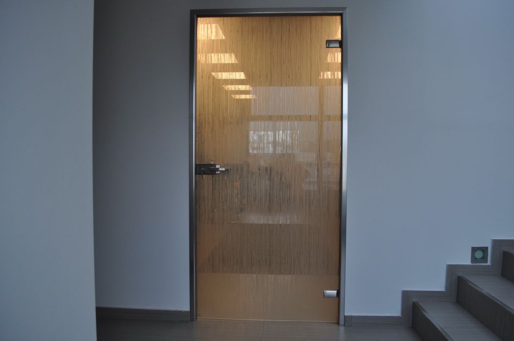 Противопожарная безрамная дверь со стеклом в БЦ в Серпухове